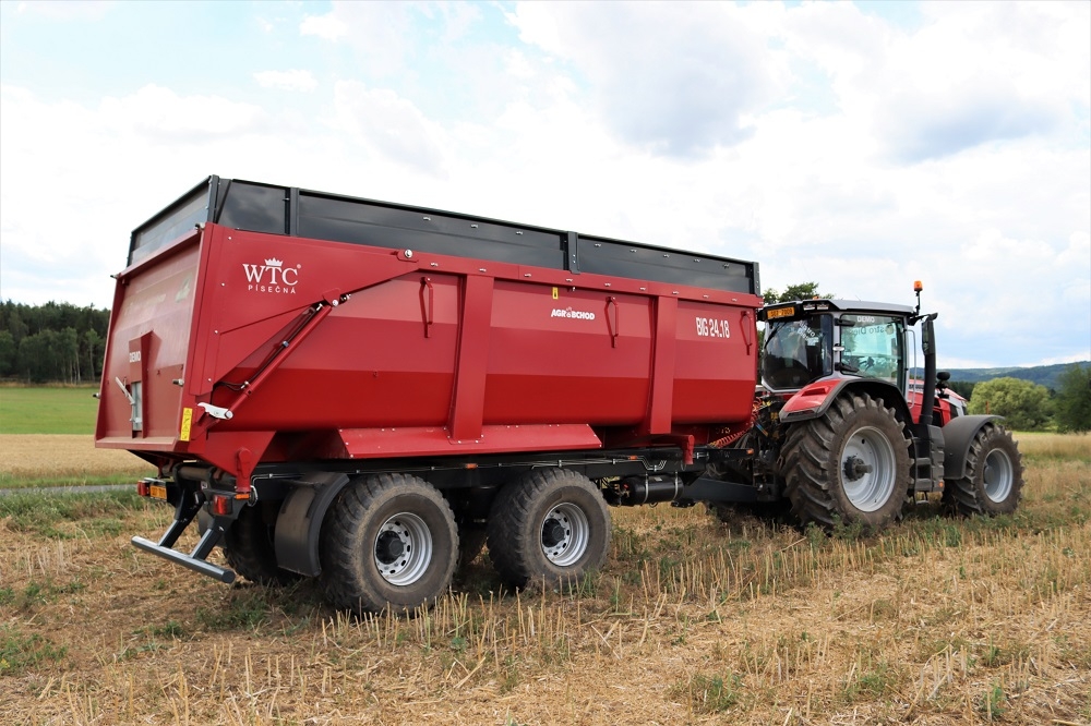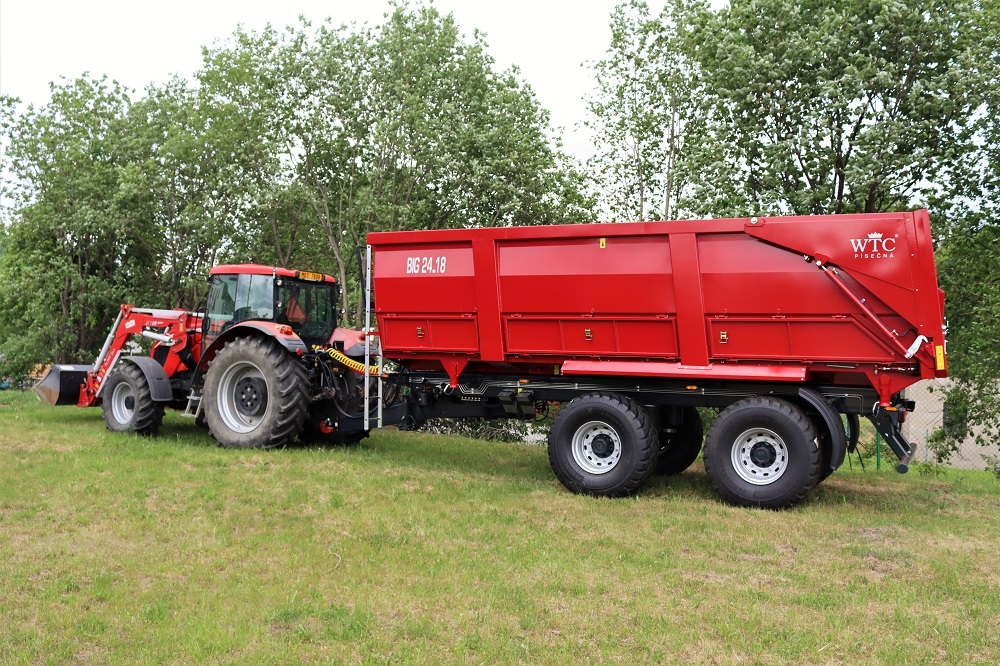 Traktorový návěs BIG 24.18 s celkovou povolenou hmotností 23 000 – 24 000 kg a nosností od 18 000 kg představuje náš největší dvouosý návěs. BIG 24.18 je vybaven odpruženou tandem nápravou ADR na 40 km/hod. (variantně 60 km/hod.), hydraulickým otevíráním i zajišťováním vrat (ovládání z traktoru), automatickou parkovací brzdou, automatickým zátěžovým regulátorem brzd, odpruženou výškově stavitelnou ojí a mnohým dalším. Návěs je vhodný zejména do zemědělských provozů nebo např. do stavebnictví.